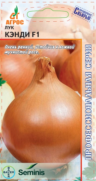 Очень ранний гибрид, устойчив к ложной мучнистой росе. При посеве семенами в открытый грунт формирует луковицу за один сезон. Луковица округлая, очень крупная, массой до 400 г, хранится до 6 месяцев. Сухие чешуи золотисто-бронзовой окраски, сочные — белоснежной. Очень вкусная, сочная и нежная мякоть КЭНДИ F1 отличается сладким вкусом и отсутствием горечи. Особенно рекомендуется для получения суперраннего урожая при выращивании рассадой.