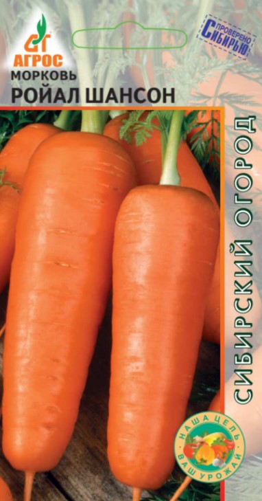 Сорт среднеспелый, отличается высокой урожайностью, сохраняемостью на корню и наилучшей лежкостью. Корнеплоды гладкие, длиной 14-16 см, конической формы, с тупым кончиком, полностью погружены в почву. Плотная мякоть ярко оранжевого цвета сочная и сладкая, с высоким содержанием сухих веществ и каротина. РОЙАЛ ШАНСОН великолепен для переработки и особенно для хранения.