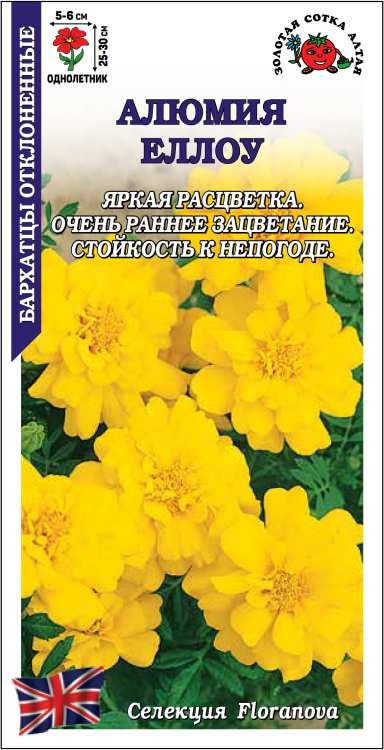 Бархатцы премиум-класса «Alumia» зацветают очень рано, еще в рассаде, их компактные кустики хорошо ветвятся, стойко выносят любую непогоду и не разваливаются от порывов ветра. Соцветия анемоновидные с крупными внешними лепестками, многочисленные, стойкой к выгоранию ярко-желтой расцветки. Сорт прекрасно подходит для украшения различных цветников и контейнеров в саду и на балконе.