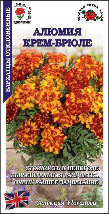 Бархатцы премиум-класса «Alumia»зацветают очень рано, еще в рассаде, их компактные кустики хорошо ветвятся, стойко выносят любую непогоду и не разваливаются от порывов ветра. Соцветия анемоновидные с крупными внешними лепестками, многочисленные, ярко-желтые с контрастными коричневато-красными мазками. Сорт прекрасно подходит для украшения цветников и контейнеров в саду и на балконе.