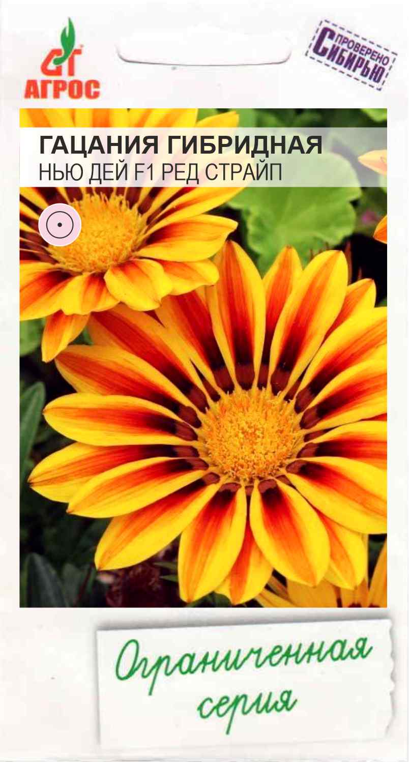 Cерия «NEW DAY F1». Однолетнее, очень нарядное растение с резными, на серебряной подкладке, красивыми листьями. Цветоносы прочные, компактные. Цветки исключительно декоративны благодаря ярким окраскам (красные с золотисто-желтой окантовкой), диаметр цветка до 7см, цветение равномерное, очень продолжительное. Гацания светолюбива, засухоустойчива и достаточно холодостойка. К почвам не требовательна, но на бедных почвах подкормки придется повторять каждые 10-15 дней до массового цветения. Поливают по мере необходимости, но всегда обильно. Семена на рассаду высевают в феврале – марте. Дружные всходы появляются через 7-10 дней, при температуре 22-24ºС. Очень широкий диапазон использования. Гацанию можно выращивать в рабатках и миксбордерах совместно с многолетниками. Красив бордюр из гацании. Великолепно смотрится она в рокарии на альпийской горке и как контейнерное растение. Срезанные в полном роспуске соцветия сохраняются в воде до 5 дней.