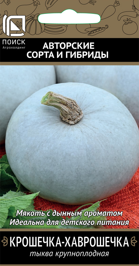 Отличные вкусовые качества. Вид крупноплодная. Среднеспелый сорт. Период от всходов до полного созревания плодов 108-118 дней. Плод округлый, гладкий, серой окраски. Сегменты слабо выражены. Масса 3-4 кг. Мякоть ярко-оранжевая, толстая, плотная, хрустящая, сладкая, с дынным ароматом. Отличается хорошей транспортабельностью, лежкостью (90-100 дней), устойчивостью к мучнистой росе. Столовое назначение.