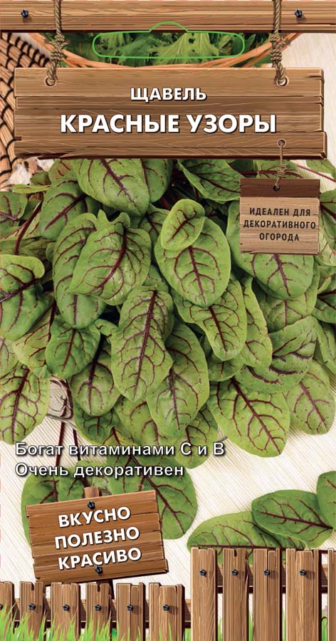 Листья овально-удлинённые, темно-зеленого цвета с контрастными жилками и черешками бордового цвета, высоким содержанием витаминов С, В, каротина и органических кислот.