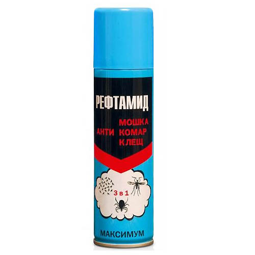 Аэрозоль "Рефтамид" Максимум - репелентное средство, предназначенное для защиты людей от нападения кровососущих насекомых (мошек, комаров,мокрецов,москитов, слепней, блох), таежных и лесных клещей при нанесении на открытые части тела, одежду, занавеси, сетки и другие изделия из ткани.