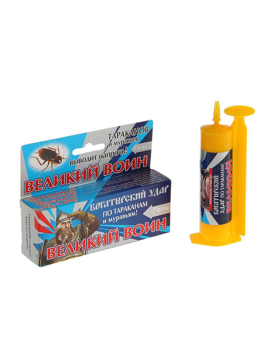 Гель «Великий воин» — средство-приманка для борьбы с тараканами. Отличительное свойство этого геля в том, что он содержит в своем составе сразу два действующих вещества (хлорпирифос и диазинон). Они усиливают действие друг друга и уничтожают даже самых устойчивых тараканов.