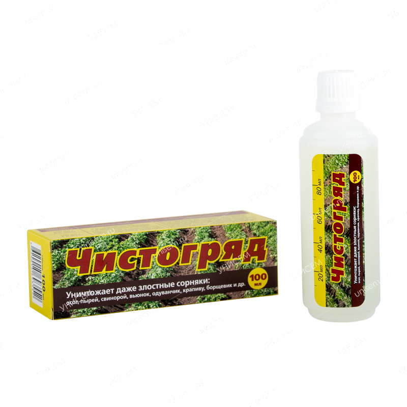 Ваше Хозяйство Чистогряд – гербицид общеистребляющего действия для уничтожения однолетних и многолетних злаковых и двудольных сорняков, в том числе злостных. Применяется на участках под посев овощных и цветочных культур, газонов, картофеля и по участкам, не предназначенных под посадку. Препарат уничтожает осот, пырей, свинорой, вьюнок, одуванчик, крапиву, борщевик и другие злостные сорняки.
