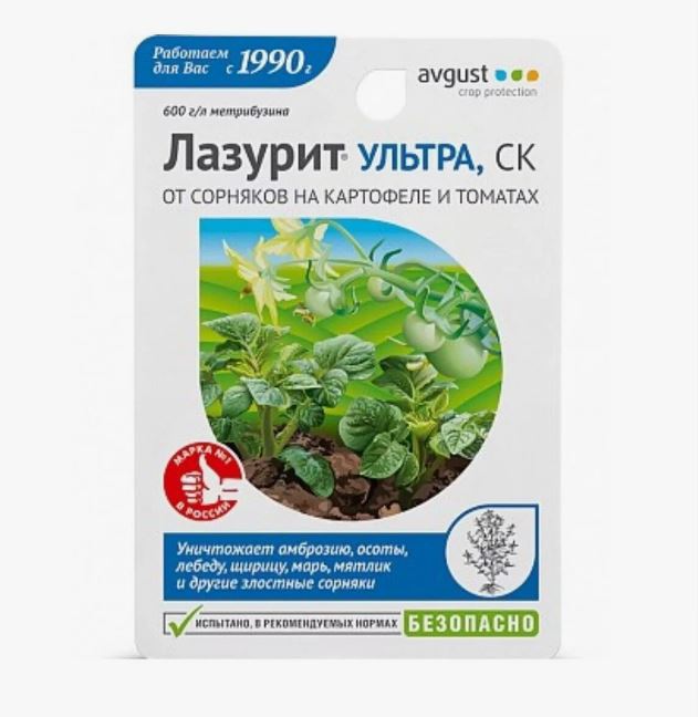 Avgust Лазурит Ультра – избирательный гербицид для томатов и картофеля. Уничтожает амброзию, горцы, звездчатку, марь, мятлик, осот, ромашку, щирицу и множество других сорных растений. Препарат создает в почве экран против прорастания сорняков, при этом не повреждает картофель и томаты, защищает посадки на протяжении 1-2 месяцев. • Обеспечивает надежную защиту от различных видов трав и сорняков.
